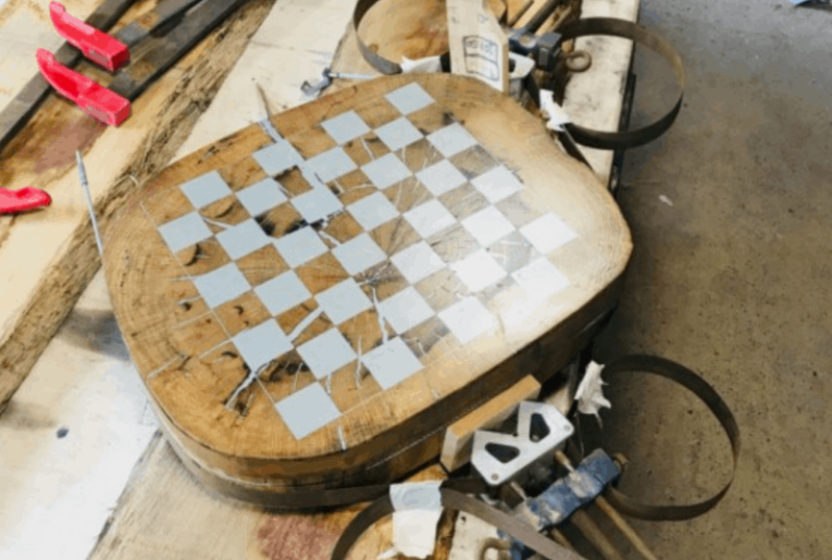 Le client conservait depuis 20 ans cette tranche de chêne (qu'il avait dû abattre pour cause de maladie) afin d'en faire un échiquier ! J'adore ce genre de commande et j'ai pris beaucoup de plaisir à le réaliser!