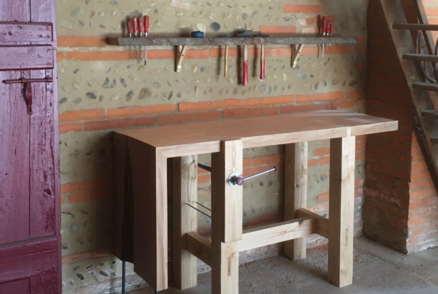 Pour cet établi en platane et châtaignier, nous avons choisi de réaliser les assemblages traditionnels tenon, mortaise et queue d’aronde.