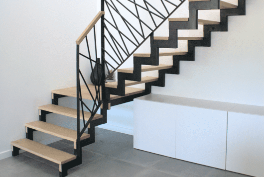 Escalier double quart tournant sur palier réalisé en bois et acier, sans contremarche pour un effet lumineux. Garde corps façon bâtons rompus.