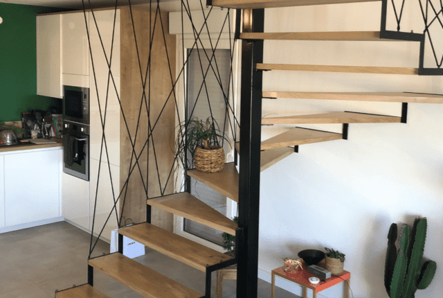 Il se démarque et crée une ambiance moderne, le garde-corps en corde noire apporte une touche d'élégance et créé un contraste visuel avec le bois et le métal.